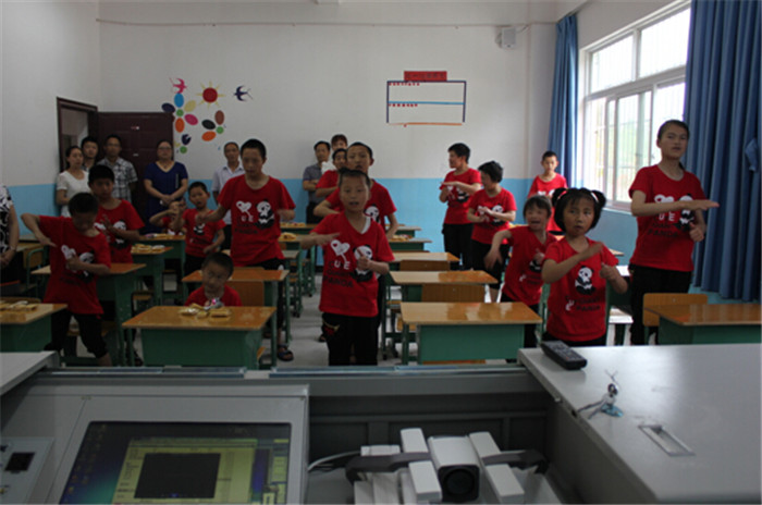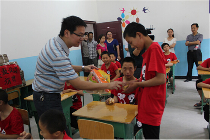 刚到学校门口,十几个孩子就围了上来,他们穿着漂亮的新衣服,亲切的叫着“叔叔、阿姨”。这群孩子的年龄从5到15岁不等,学校的老师比普通老师付出了更多的爱心、更大的精力来照顾他们。通过一年的学校生活,孩子们的行为习惯得到了改善,沟通能力得到了提高。随后,范莉常委在教室中为孩子们发放了带来的零食,孩子们显得非常兴奋,不住的说着谢谢,有的语言表达能力有困难的孩子,就微笑的竖起大拇指表示感谢。范常委为孩子送去了节日的祝福,希望他们听老师的话,健康快乐的长大。孩子们吃完零食后,在老师的带领下,表演了手语舞《感恩的心》,尽管这群特殊孩子们的手语舞不整齐,还略显笨拙,却带给了我们不一样的感动。
